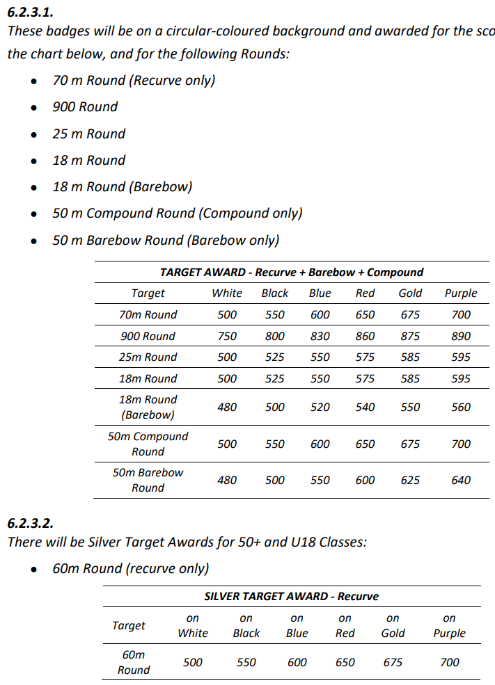 Hægt er að sjá á myndinni hér fyrir neðan helstu vegalengdir og skor í markbogfimi (target archery). Nánari upplýsingar er hægt að finna um verðlaunin í reglubók 2 kafla 6,2 í reglubókum heimssambandsins WA